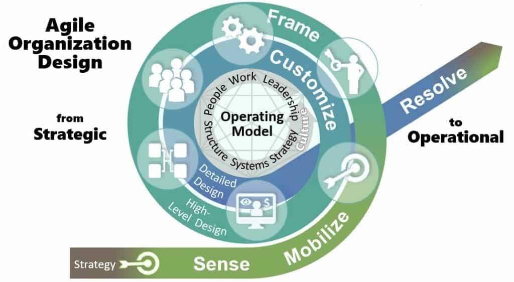 The former schoolteacher moved quickly when she assumed the helm to quell the high level of staff anxiety created by her predecessor. She announced that no one would lose their jobs if they were willing to learn new skills and collaborate on the redesign. That helped drive the fear out of the organization. The next thing she did was to determine a road map for the way forward. She did not have the time or the interest in using a top-down approach and she understood the importance of engaging the workforce. Because of her leadership style and high level of emotional intelligence, among the options purposed for the transformation in the Sensing phase, she and her leadership team selected the high engagement process of the Axelrod’s Conference Model of Change that would involve four or five large conferences. That aligned and influenced the development of Agile Organization Design. She said it would be the perfect way for her new leadership team, employees and stakeholders to collectively learn and grow adaptive skills through the process of co-creating their own future.